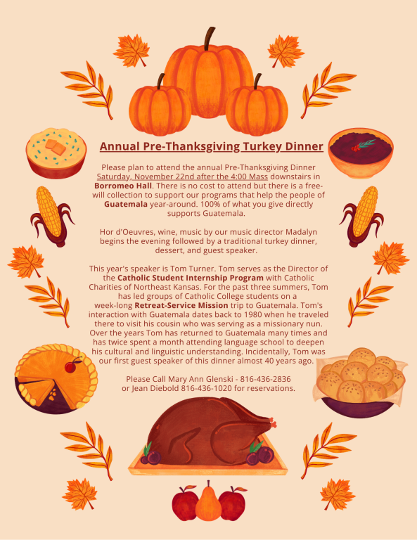 Please plan to attend the annual Pre-Thanksgiving Dinner Saturday, November 22nd after the 4:00 Mass downstairs in Borromeo Hall. There is no cost to attend but there is a free-will collection to support our programs that help the people of Guatemala year-around. 100% of what you give directly supports Guatemala.